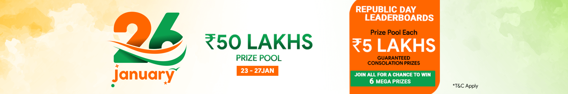PlayRummy would like to welcome you to play the Republic Day Leaderboards Contest With Large bounty Prize of ₹50,00,000 as cash Prize.
